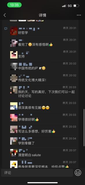 在此基礎(chǔ)上,給學(xué)生布置了一個(gè)題為《我學(xué)<黃帝內(nèi)經(jīng)>》的任務(wù),就是以靈活的、個(gè)性化的方式表達(dá)在朋友圈發(fā)布他們專題學(xué)習(xí)收獲和啟發(fā),作為一種初步市場(chǎng)調(diào)研和用戶研究方式,收集周邊人群對(duì)相關(guān)話題的看法。(見(jiàn)圖3)