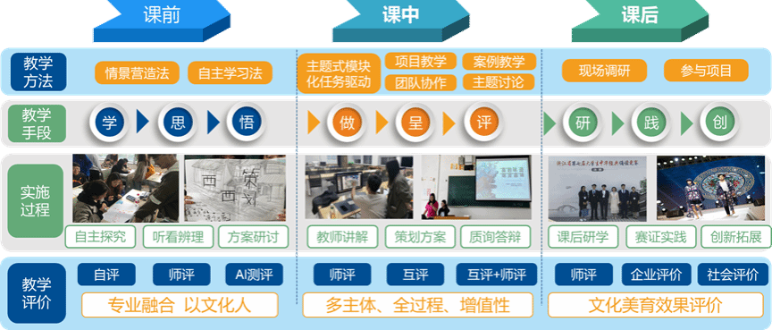 課中“做、呈、評”。通過分析優(yōu)秀文化活動策劃和組織案例,找準(zhǔn)文化活動策劃的獨特視角,服務(wù)特定文化活動項目,確定活動的主題、內(nèi)容、風(fēng)格,設(shè)計策劃方案,用創(chuàng)意思維組織專業(yè)且富有創(chuàng)造力的活動策劃呈現(xiàn),將新穎獨特的文化創(chuàng)意與生動有效的呈現(xiàn)方式有機(jī)地結(jié)合起來,通過創(chuàng)設(shè)活動的具體環(huán)境、氛圍的營造等新穎的文化包裝手段,將文化內(nèi)容有效的傳達(dá)給公眾,培養(yǎng)發(fā)現(xiàn)美、感知美、分辨美和表達(dá)美的能力。通過教師分析和生生互評,提升學(xué)生鑒美能力和審美境界,培養(yǎng)正確的審美意識和健康向上的審美情趣。