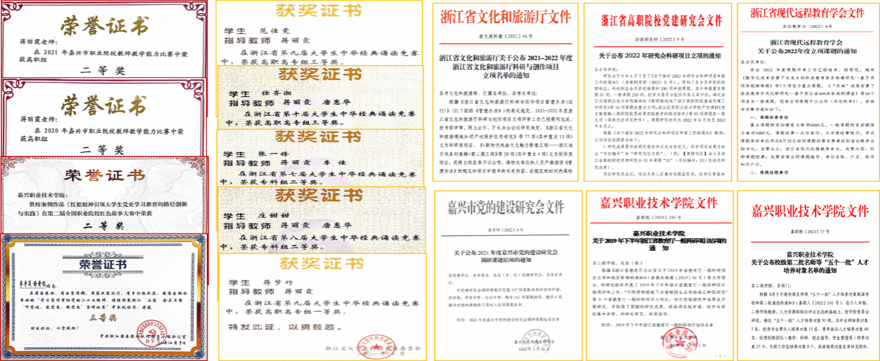 課程教學(xué)團(tuán)隊經(jīng)過多年積累和建設(shè),在“崗-課-賽-證”融通的基礎(chǔ)上,構(gòu)建了以非遺文化為特色,融合“教學(xué)-科研-競賽”為一體的融合型團(tuán)隊。團(tuán)隊先后獲得嘉興市教學(xué)能力比賽二等獎兩項,承擔(dān)浙江省文旅廳、教育廳等科研項目十余項,指導(dǎo)學(xué)生紅色故事創(chuàng)意大賽、經(jīng)典誦讀大賽省部級獎項十余項(見圖6)。
