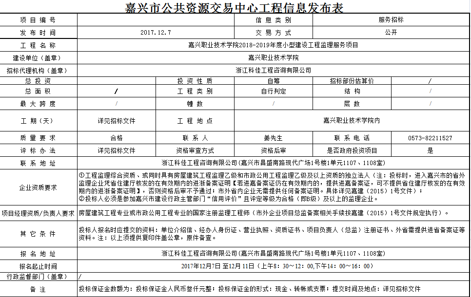 嘉興職業(yè)技術學院2018-2019年度小型建設工程監(jiān)理服務項目