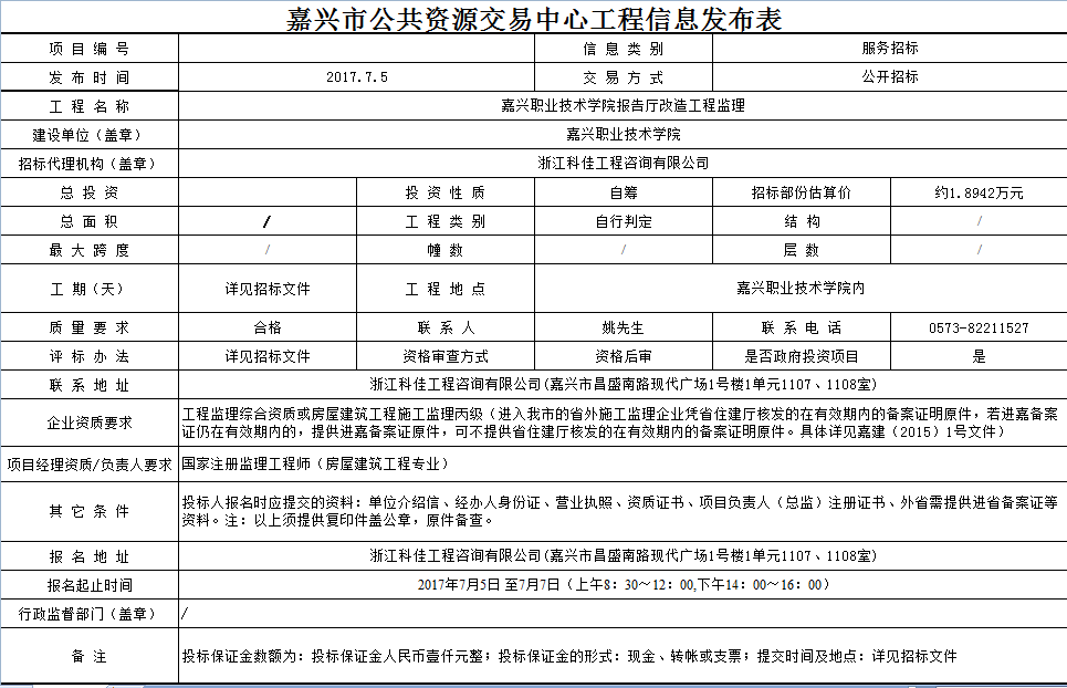 嘉興職業(yè)技術(shù)學(xué)院報(bào)告廳改造工程監(jiān)理信息發(fā)布表