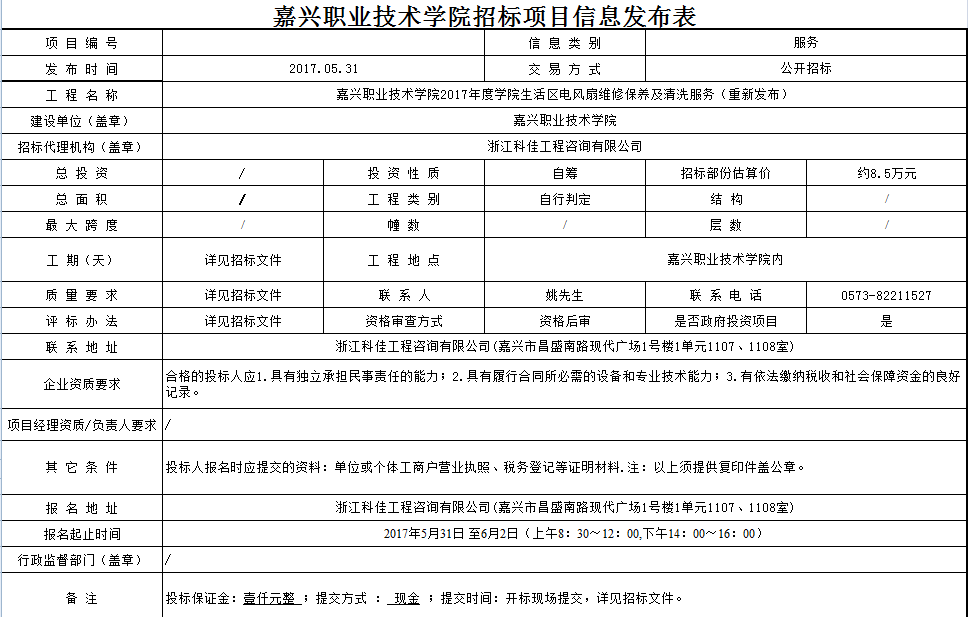 嘉興職業(yè)技術(shù)學(xué)院招標(biāo)項(xiàng)目信息發(fā)布表嘉興職業(yè)技術(shù)學(xué)院2017年度學(xué)院生活區(qū)電風(fēng)扇維修保養(yǎng)及清洗服務(wù)(重新發(fā)布)