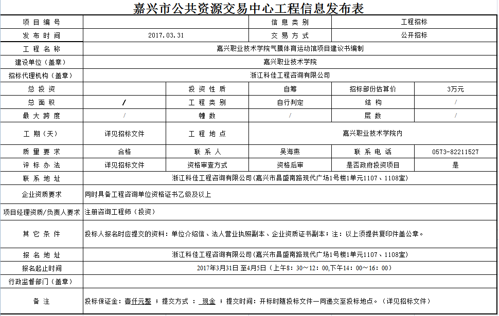 嘉興市公共資源交易中心工程信息發(fā)布表-嘉興職業(yè)技術(shù)學院氣膜體育運動館項目建議書編制