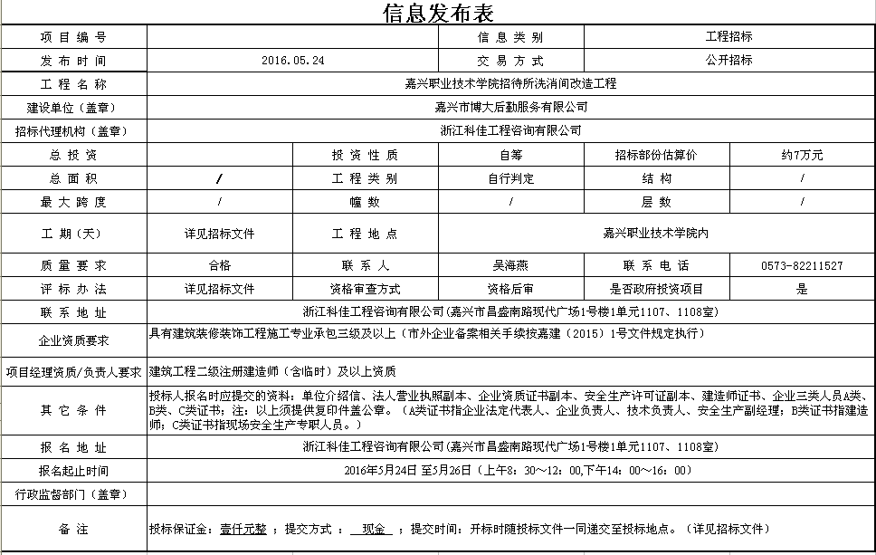 嘉興職業(yè)技術(shù)學(xué)院招待所洗消間改造工程信息發(fā)布表