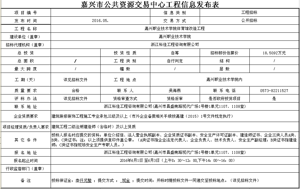 嘉興職業(yè)技術(shù)學(xué)院體育館改造工程信息發(fā)布表