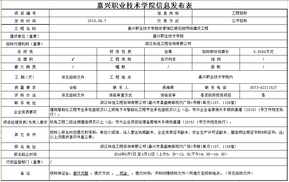 嘉興職業(yè)技術(shù)學(xué)院體育館區(qū)域無線網(wǎng)絡(luò)建設(shè)工程信息發(fā)布表