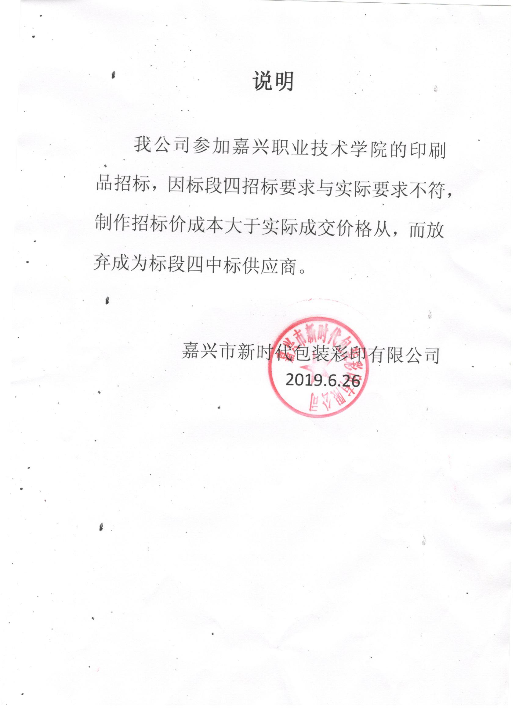 因原中標(biāo)供應(yīng)商嘉興市新時(shí)代包裝彩印有限公司不能履行嘉興職業(yè)技術(shù)學(xué)院2019年6月6日在學(xué)院網(wǎng)站上發(fā)布的嘉興職業(yè)技術(shù)學(xué)院印刷品制作詢價(jià)招標(biāo)(嘉興職業(yè)技術(shù)學(xué)院印刷品制作詢價(jià)單公告網(wǎng)址:http://www.hzjianqian.com/sbc/news/155979482988311094.html)中的第四標(biāo)段。附原中標(biāo)單位情況說明。